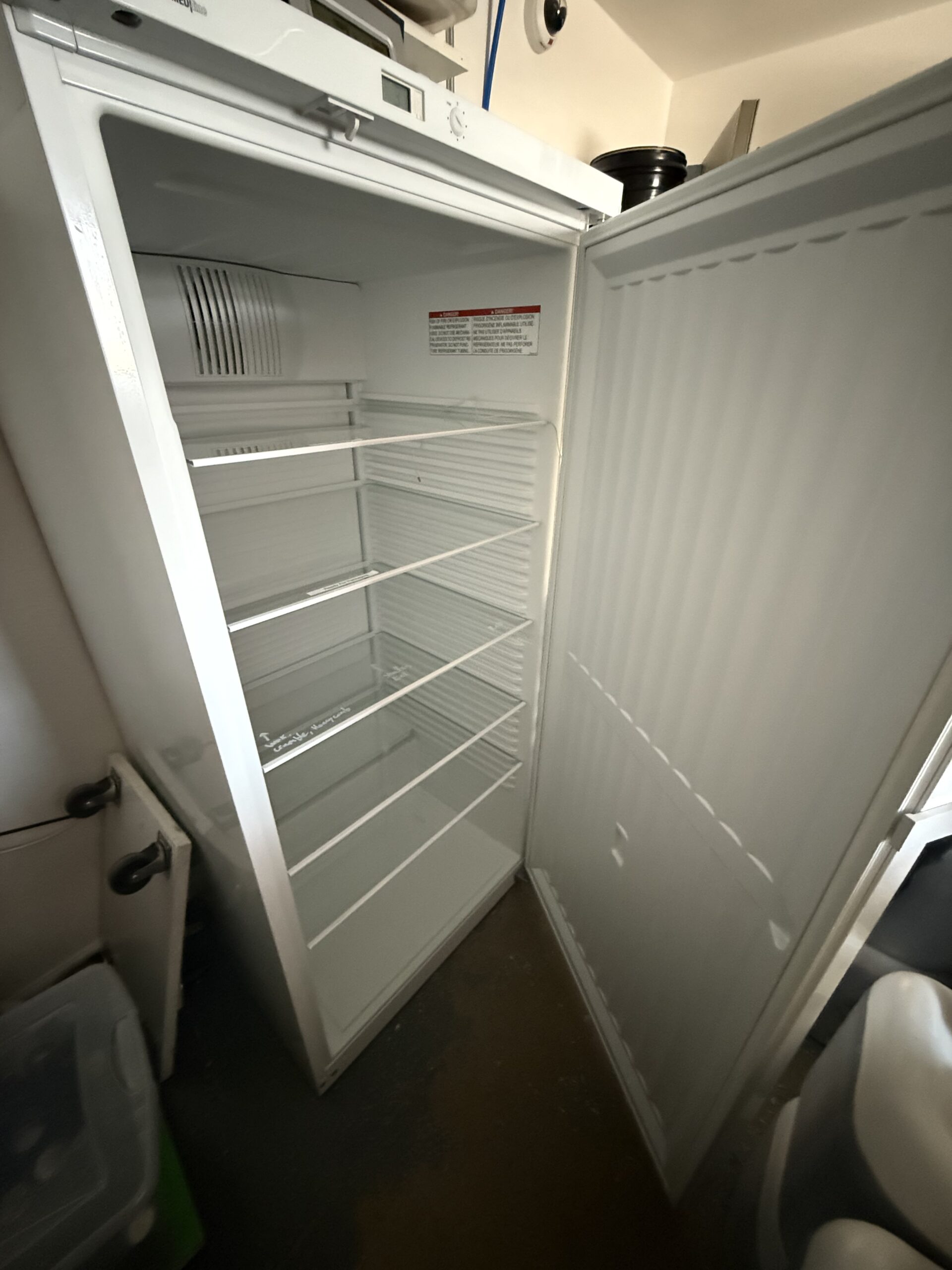 This unit is ideal for labs handling solvents, reagents, or chemical inventories that require both cooling and regulatory compliance. The interior features stainless steel surfaces, adjustable wire shelves, a self-closing door, and digital temperature/alarm electronics with visual and audible alerts. The refrigerator is also equipped with reversible door hinges and can integrate with external alarm-forwarding systems via volt-free contacts.